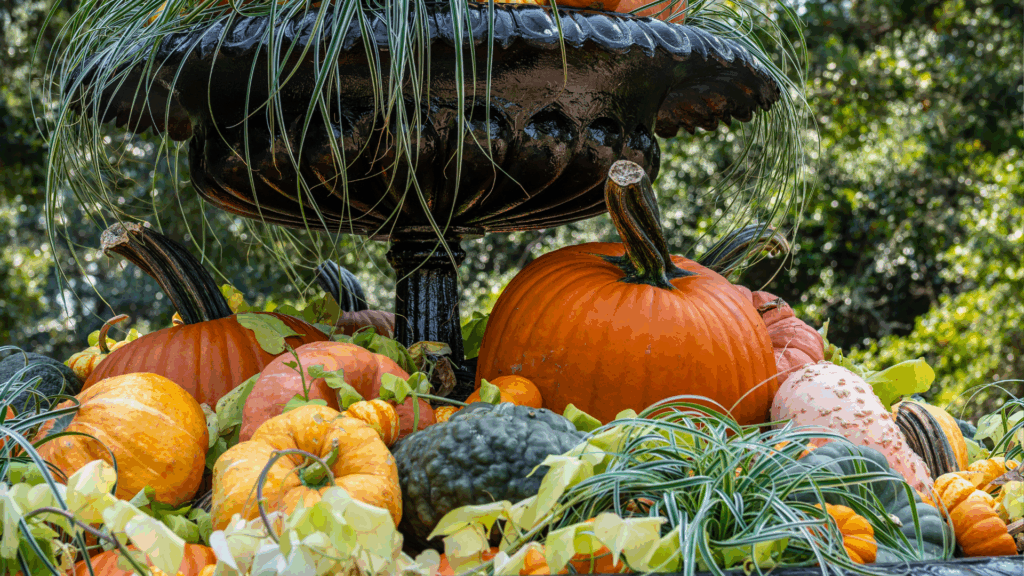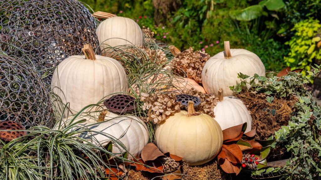 Finally, while we think you’ll be amazed at some of the larger than life pumpkin displays, we hope you’ll find the dozens of smaller groupings tucked away in the many nooks and crannies around the garden to be something that you might repeatable on your own front porch.