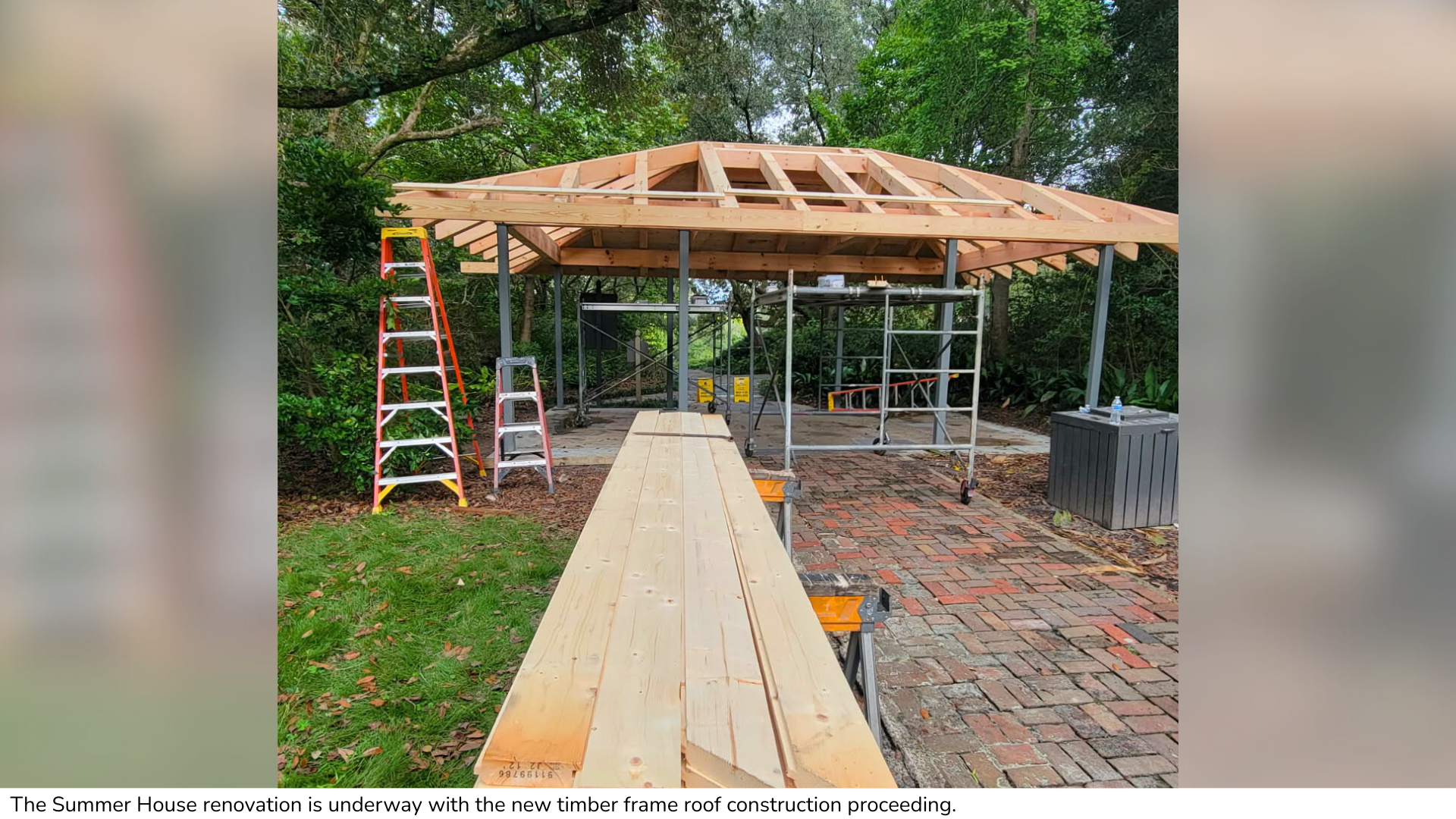 1. The Summer House renovation is well underway. As of this writing, the timber frame roof has been erected and tongue-and-groove roof cladding is partially installed. Work is also underway for a plaque that will recognize our major donors to this project. When completed, this restoration will showcase the level of design, detail, and craftsmanship that we will apply to all future work done in enacting the Master Plan. With the refurbished iron lace being the next step in this construction project, that will only leave the copper roof to be installed, something that may have to wait until after the 2025 Magic Christmas in Lights season is finished.