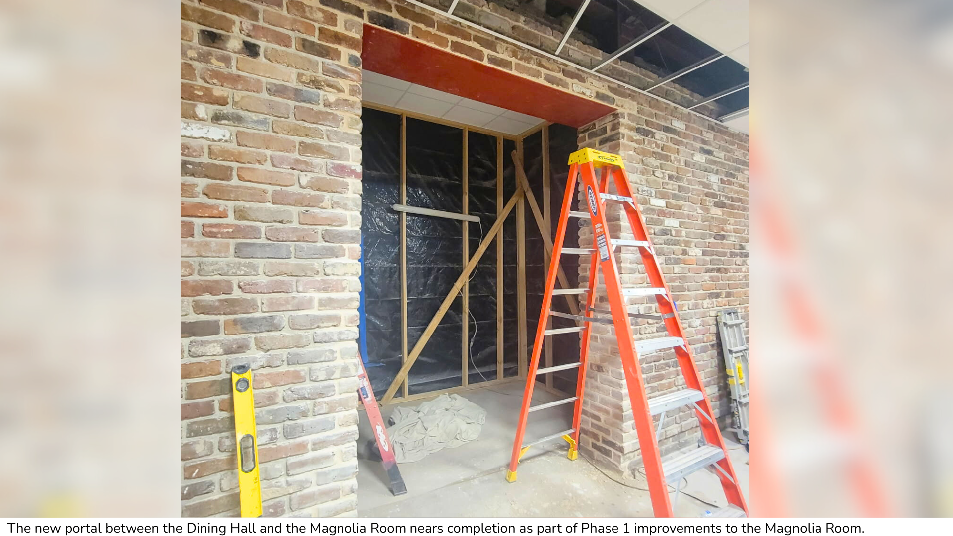 2. The Magnolia Room Phase 1 improvements project is also underway, to the point that work should be completed within another week or so. The two major changes that Phase 1 brings to this conference room are that a) a corridor now exists for Café staff to walk from the Kitchen to the Pantry without having to interrupt guests in the Magnolia Room, and b) a connecting doorway now opens the Magnolia Room up to the Dining Hall, providing us with flexibility for renting each room separately, or together. Phase 2 will see floor and ceiling treatments for the Magnolia Room, but no timetable is yet set for this phase. We extend our sincere gratitude to The Dr. Monte L. Moorer Foundation Charitable Trust, The A.S. Mitchell Foundation, and The Julien E. Marx Foundation Trust for their generous support in making this project possible.